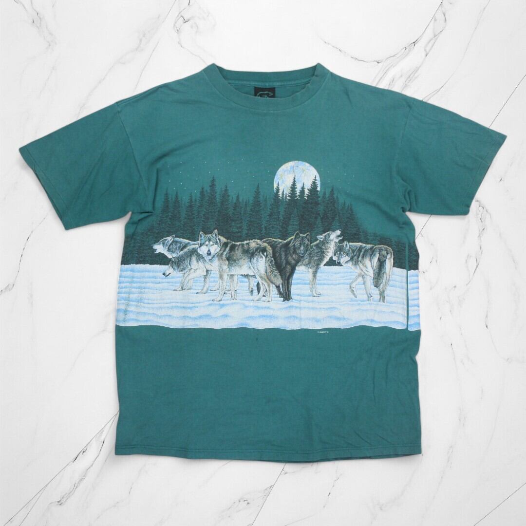 古着 90s USA製 HABITAT ANIMAL T-SHIRTS GREEN アニマル柄 動物 Tシャツ シングルステッチ 【Vintage】