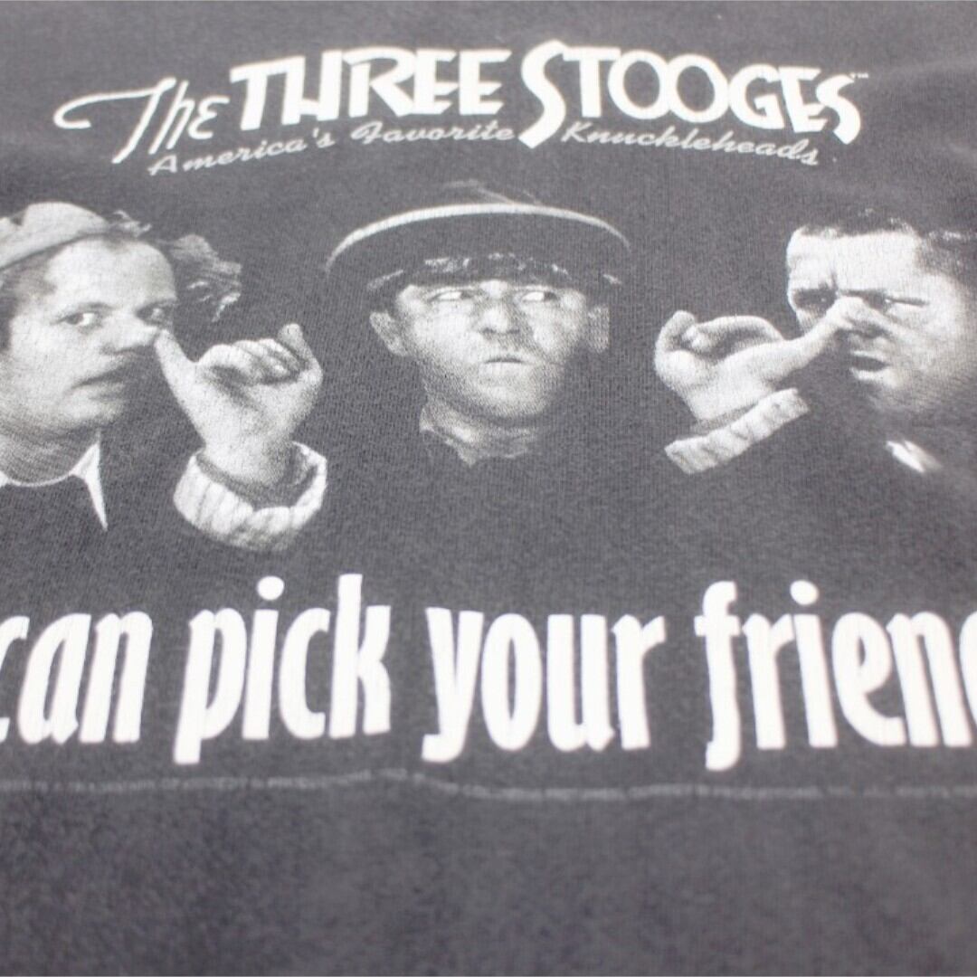 USA製のヴィンテージTシャツで、シングルステッチ仕様やフェード感のあるブラックカラーが、90年代らしい雰囲気をしっかりと残しています。片面に施された「スリーストゥージズ」プリントはインパクトがあり、プリント自体には経年による劣化も見られますが、それも含めて味のある一着に仕上がっています。