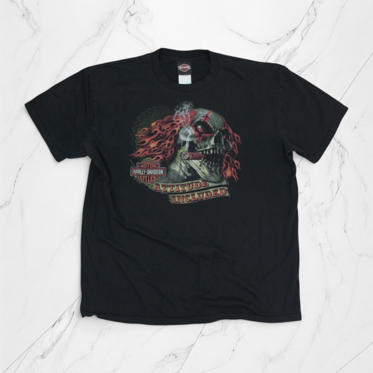 フロントには炎を背負い葉巻をくわえたスカルの強烈なアートワークと“ATTITUDE INCLUDED”の文字がプリントされたインパクト抜群のデザイン。