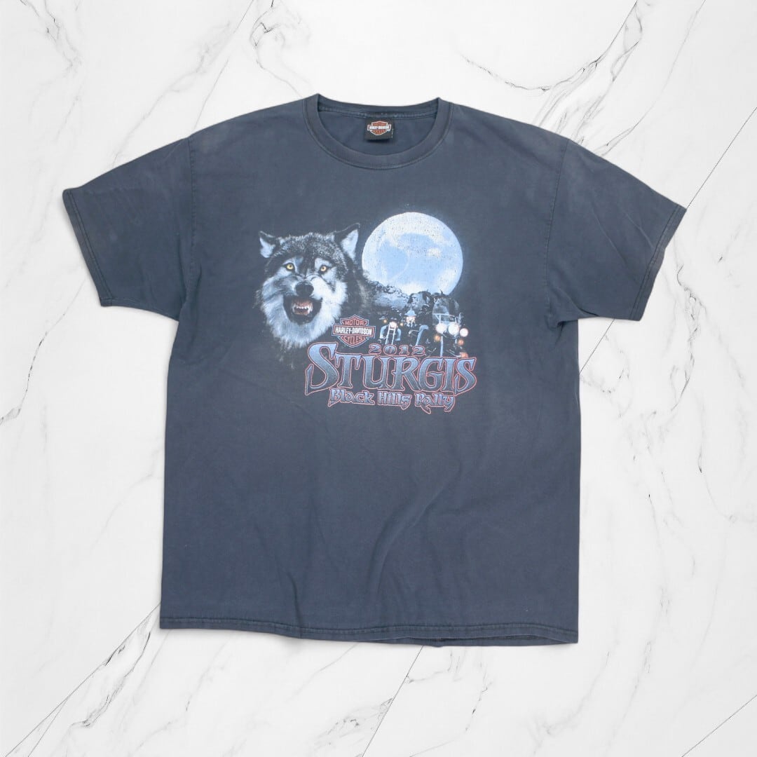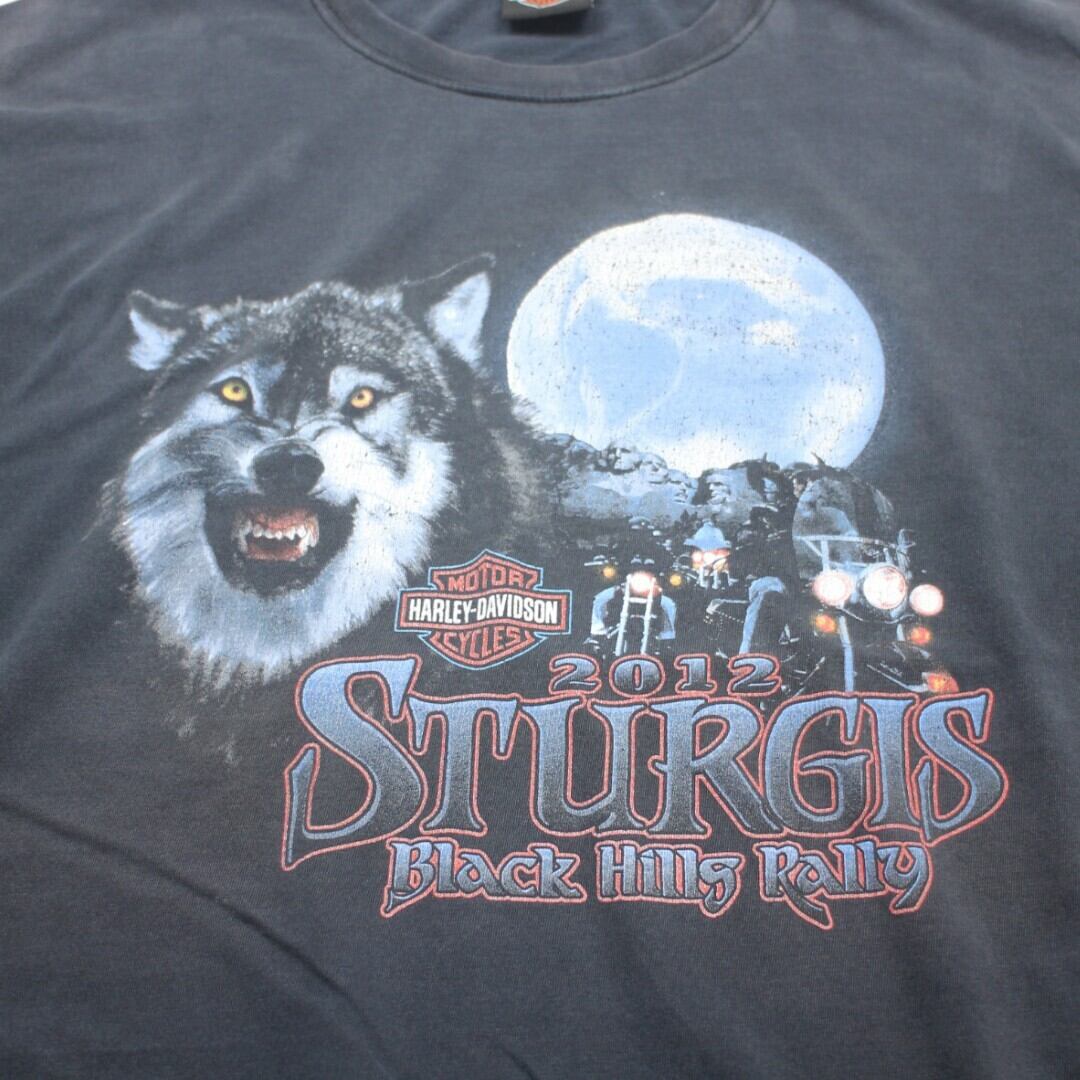 2012年Sturgis Black Hills Rallyのデザインで、フロントには狼とバイク、バックにはサウスダコタ州Keystoneをモチーフとしたプリントが施された存在感のある一枚です。