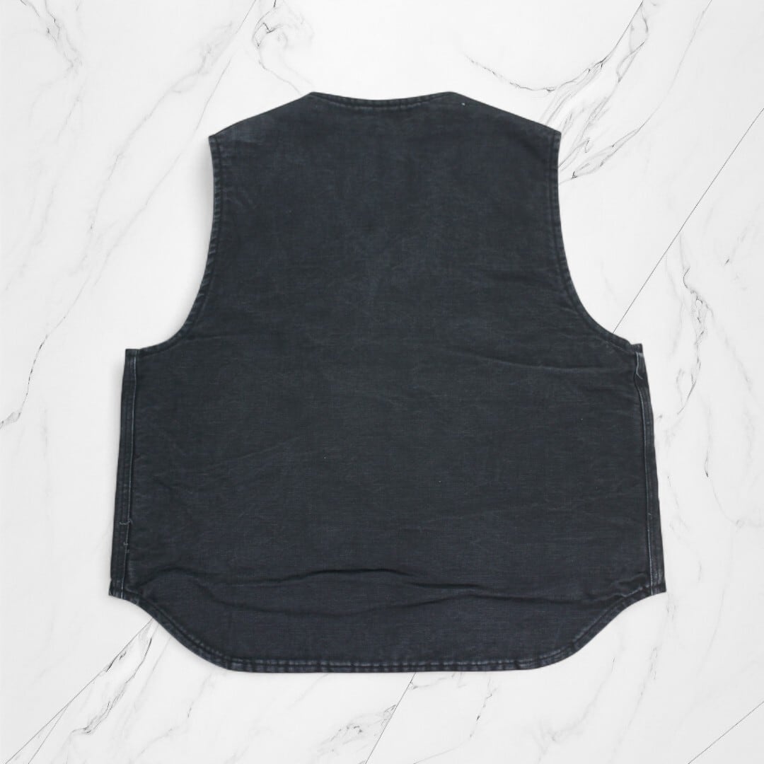 古着 90s USA製 Carhartt Duck Vest V03 BLK。ワークウェアブランドならではの丈夫なダック地を使用したベストで、裏地はボア仕様となっており保温性に優れています。シンプルながら存在感のあるデザインで、レイヤードスタイルにも最適なヴィンテージアイテムです。