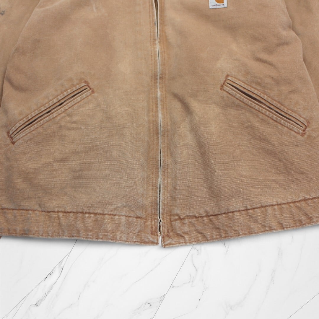 古着 00s USA製 Carhartt Detroit Jacket J01 BRN。ワークウェアの定番として人気の高いデトロイトジャケット。タフなダック地とコーデュロイ襟のコンビネーションが特徴で、ヴィンテージならではのフェード感が雰囲気抜群の一着です。裏地はブランケットライナー仕様で保温性も高く、タウンユースからワークシーンまで幅広く活躍します。