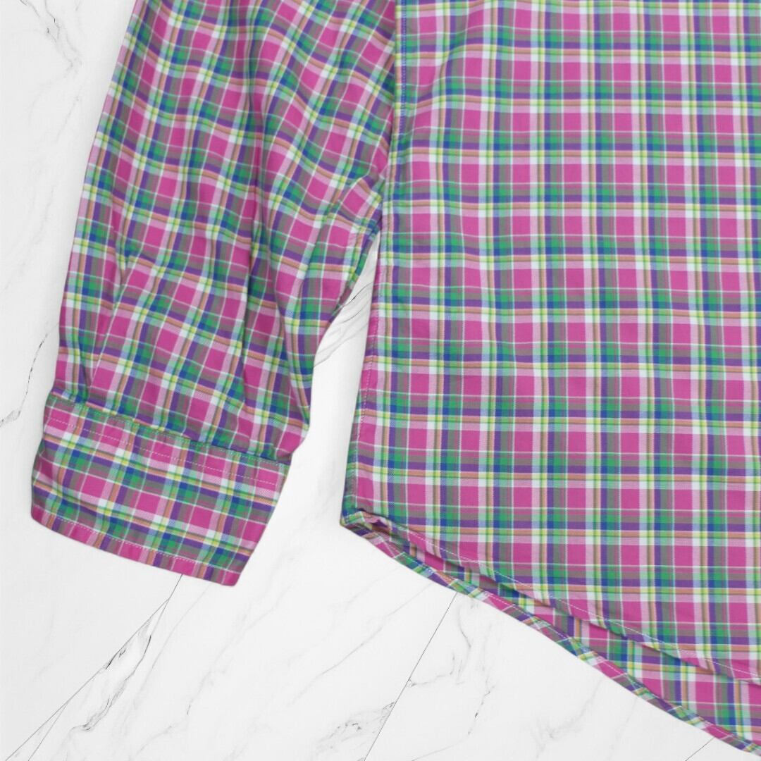 ピンク系をベースとした鮮やかなチェック柄に胸元のポニーロゴ刺繍が映えるデザイン。