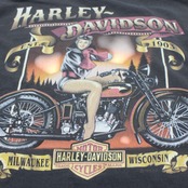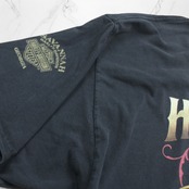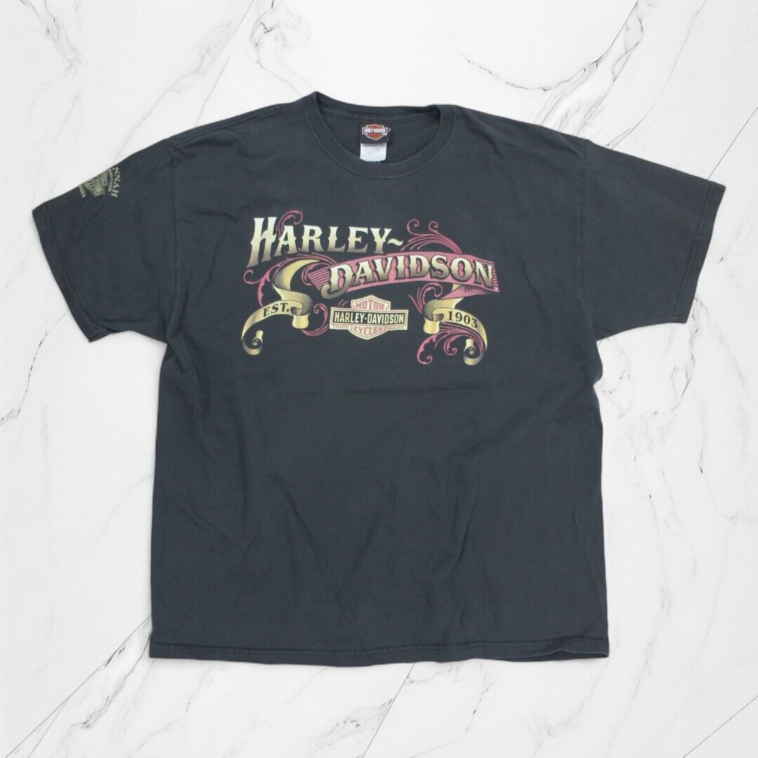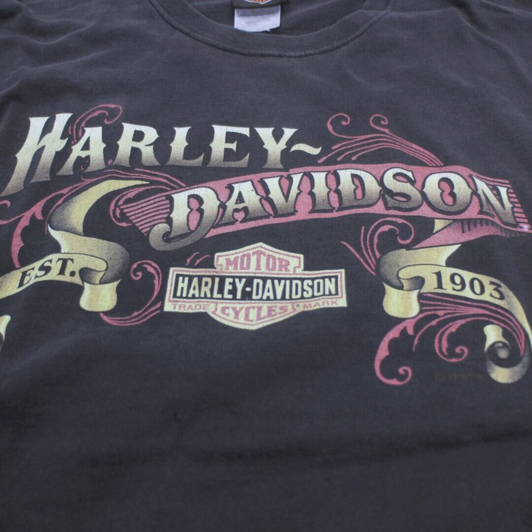 フロントには「HARLEY DAVIDSON EST.1903」のロゴプリント、バックには女性とヴィンテージバイクをモチーフにした迫力あるグラフィックが描かれています。右肩にもプリントが入っており、細部までこだわりを感じられる一枚。