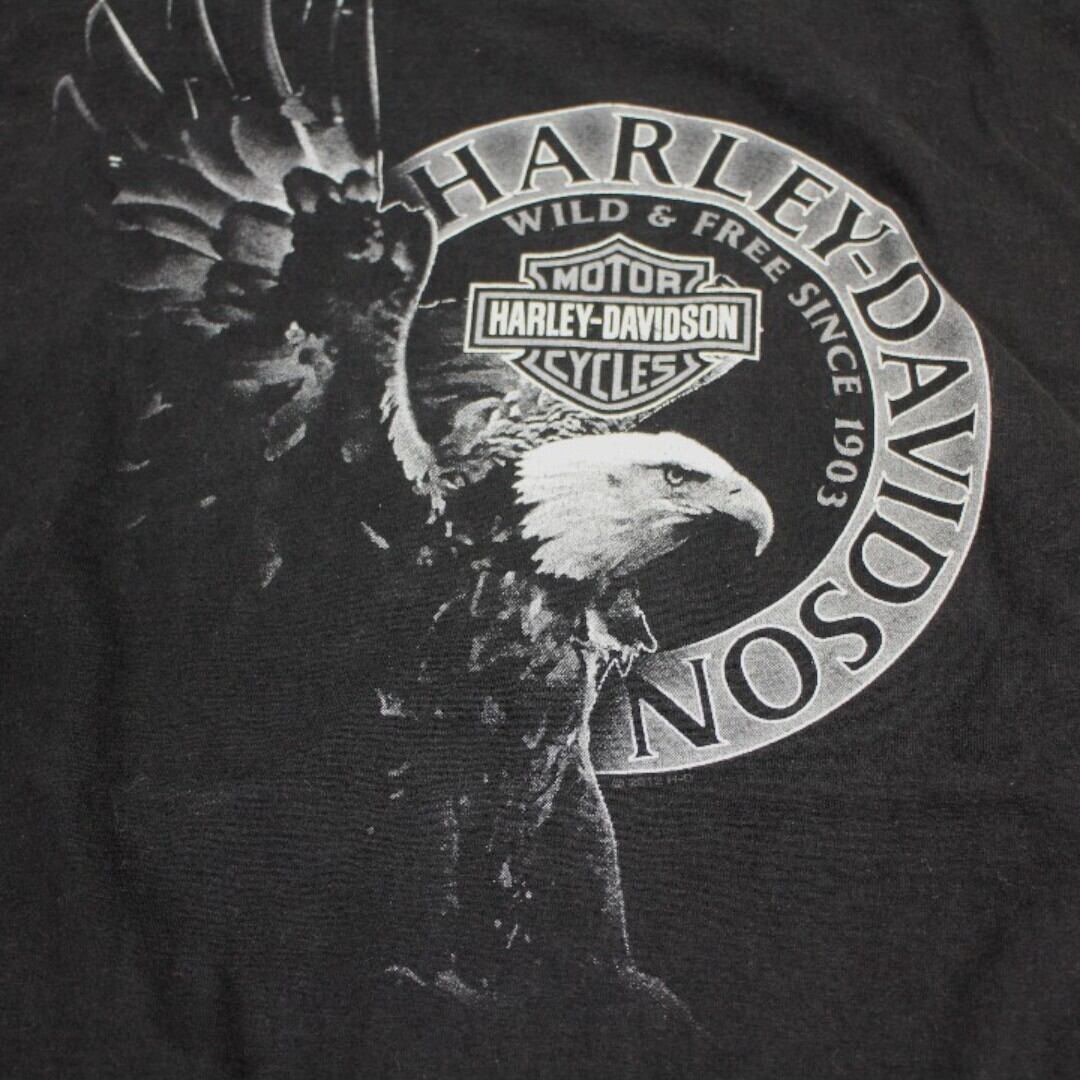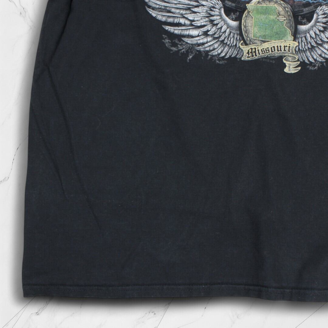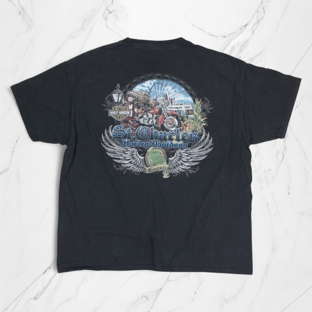 フロントにはイーグルをモチーフにしたモノクロデザイン、バックには「St. Charles Harley-Davidson Missouri」の迫力あるプリントが施された両面プリント仕様。