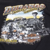 フロントには女性デザインの大胆なグラフィック、バックには「DURANGO COLORADO」のショップロゴと蒸気機関車のデザインがプリントされた両面仕様。