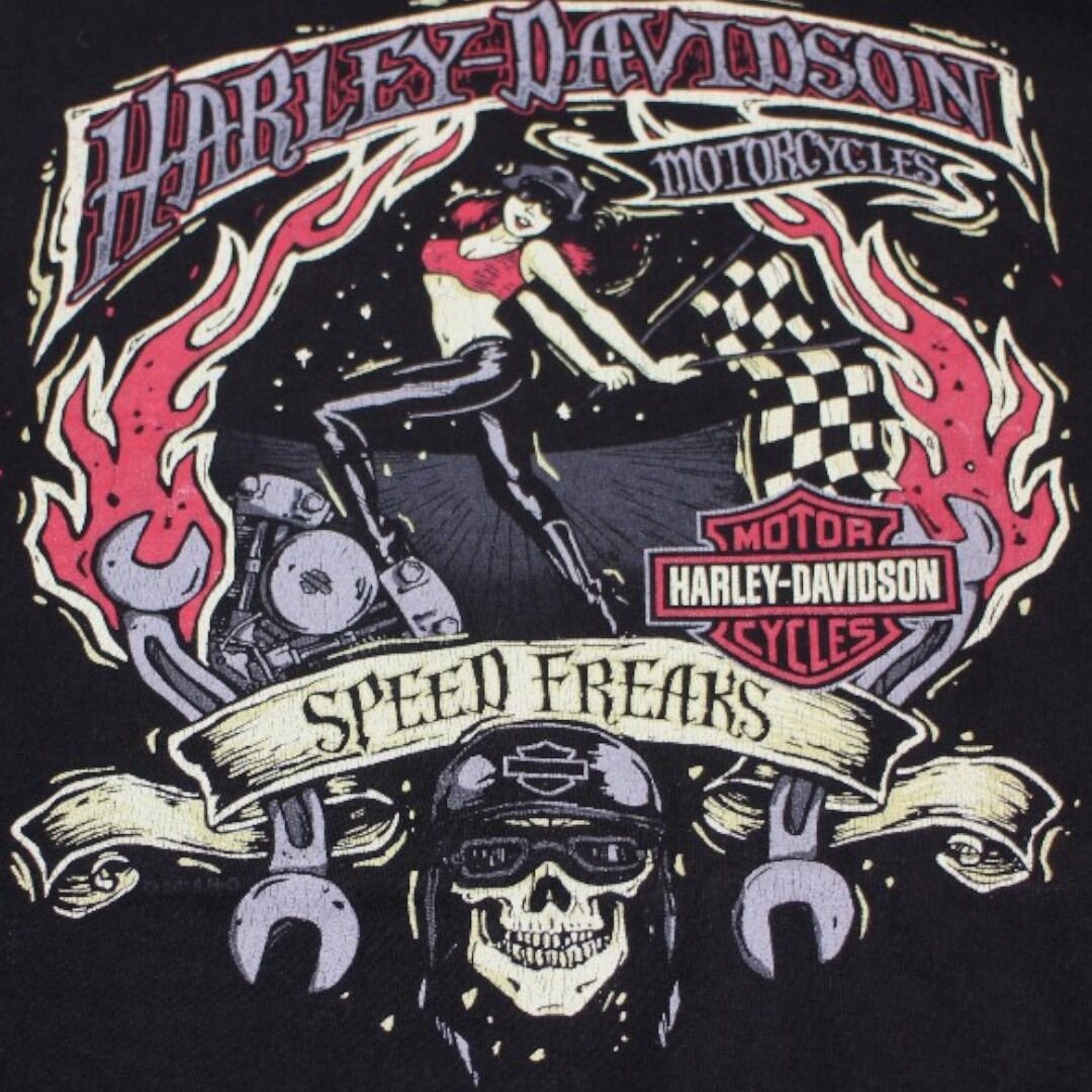 フロントにはフレイムデザインと女性キャラクターの「SPEED FREAKS」ロゴ、バックには「Space Coast Harley Davidson Palm Bay, Florida」のグラフィックが施された両面プリント仕様。