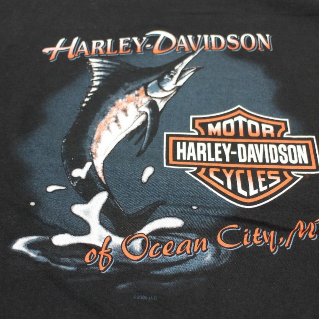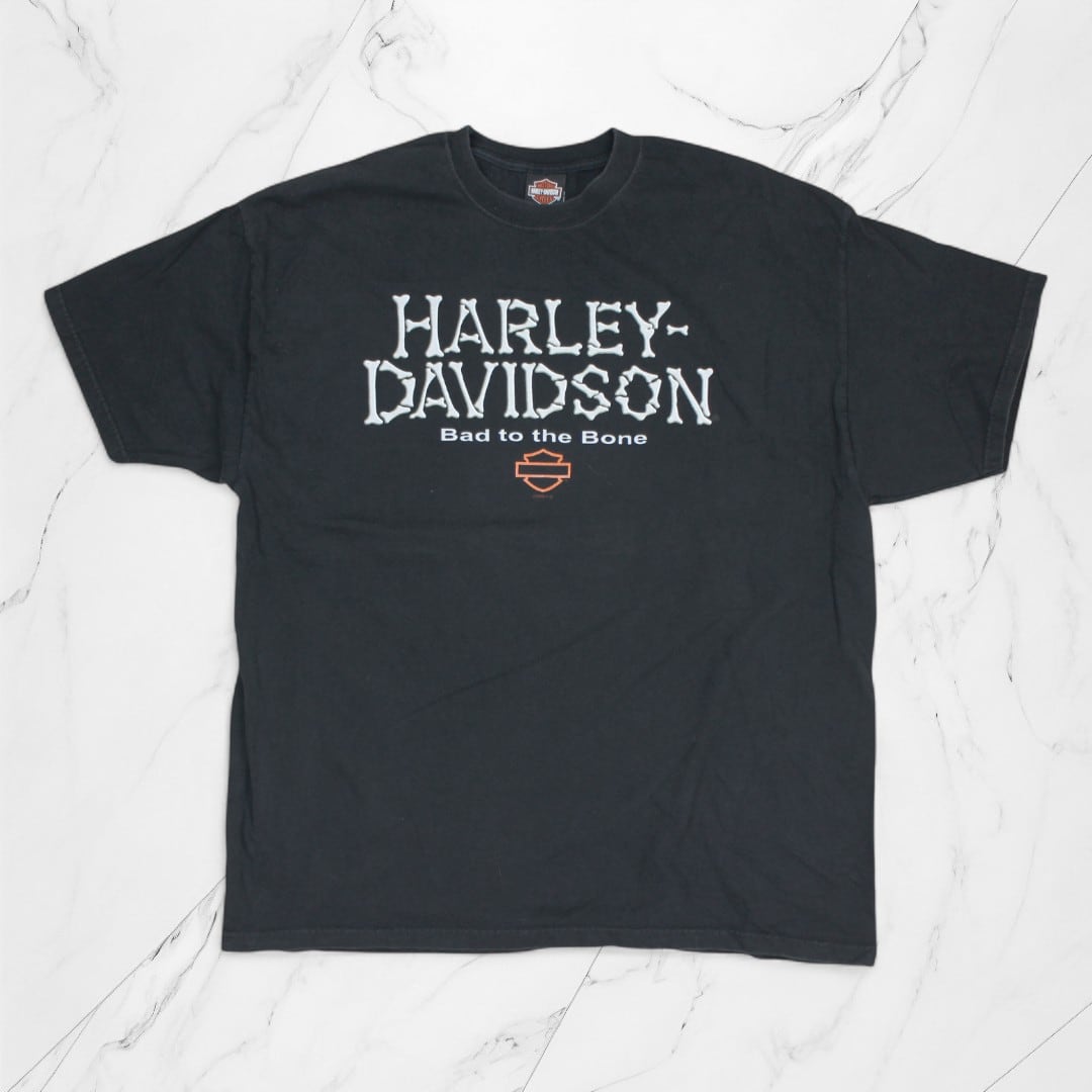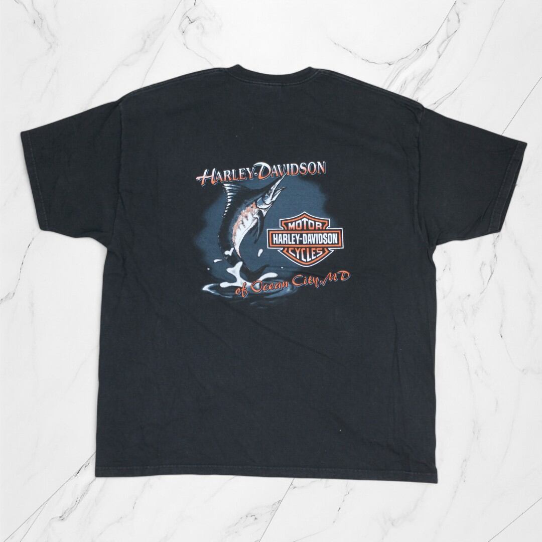 フロントには「HARLEY-DAVIDSON Bad to the Bone」のロゴデザイン、バックには大きな魚とブランドロゴが描かれた両面プリント仕様。