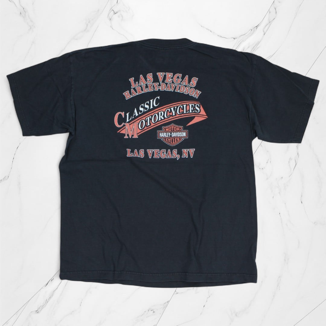 フロントに定番のバー&シールドロゴ、バックには「LAS VEGAS」のショップロゴがプリントされた両面仕様。