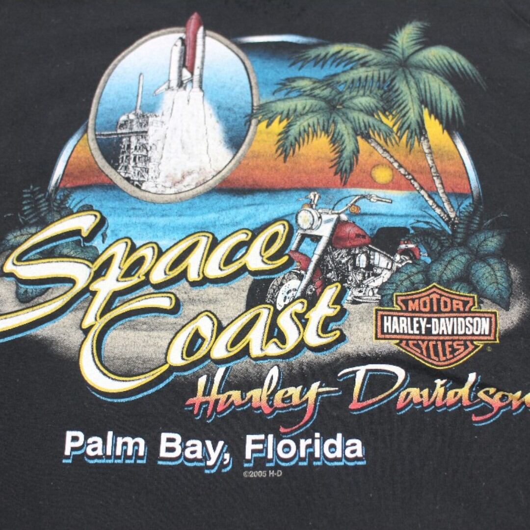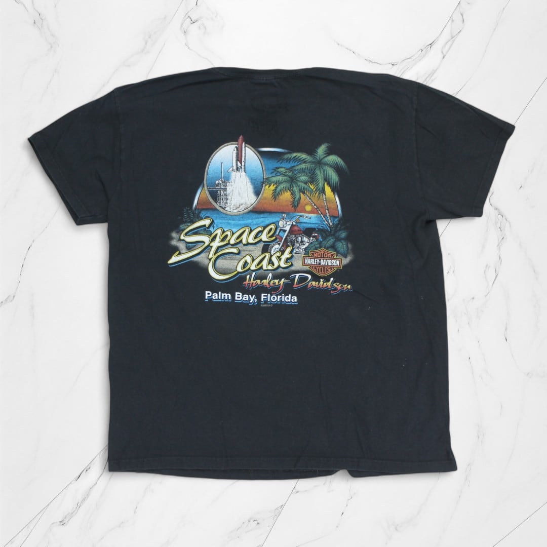 フロントにはブルーフレイムとブランドロゴ、バックには「Space Coast Harley Davidson Palm Bay, Florida」のグラフィックがプリントされた両面デザイン。