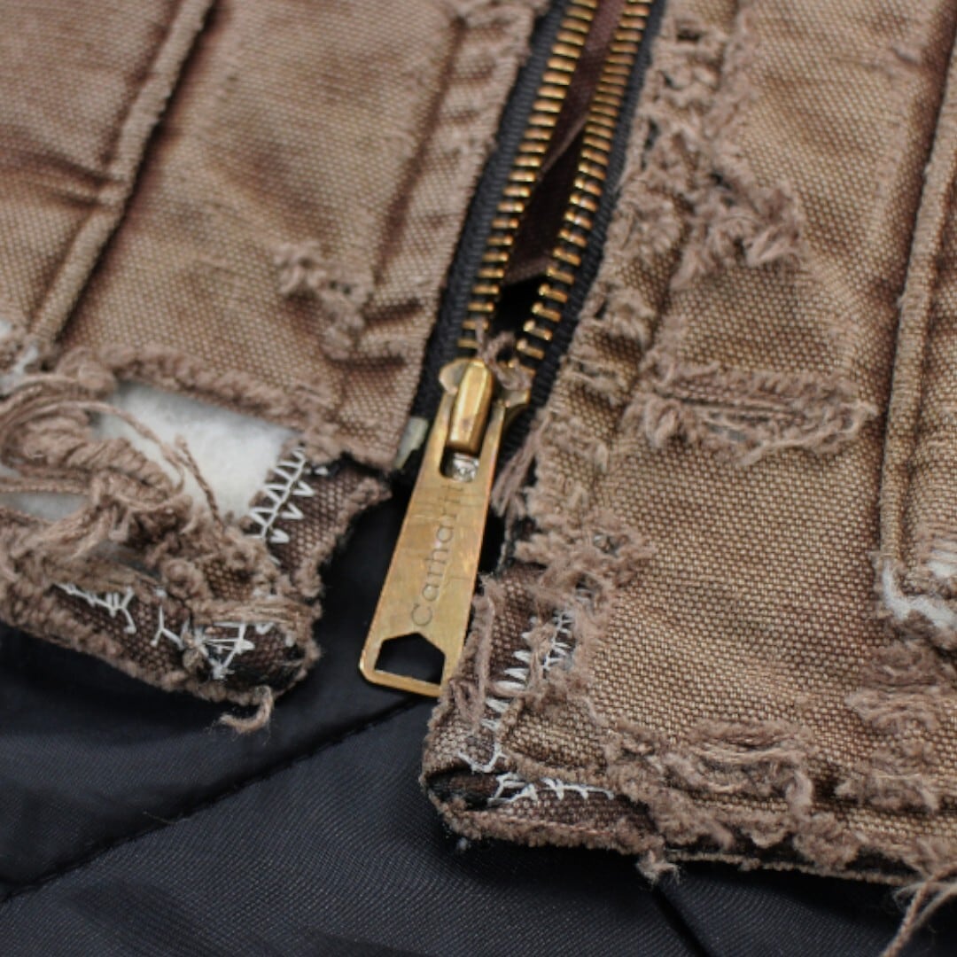 裾やフロント部分にヴィンテージらしいほつれ・ダメージがあり、リアルなエイジングを感じさせる一着。