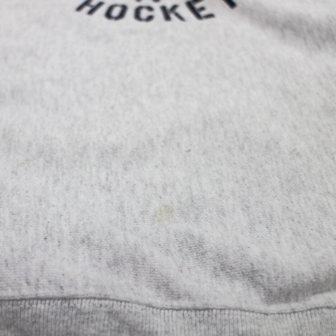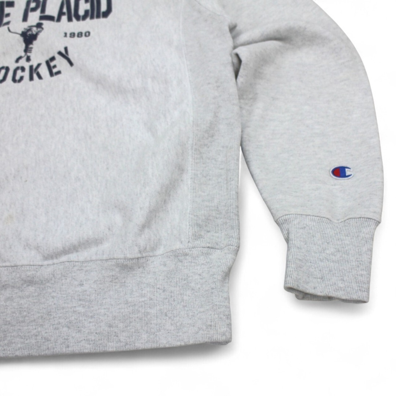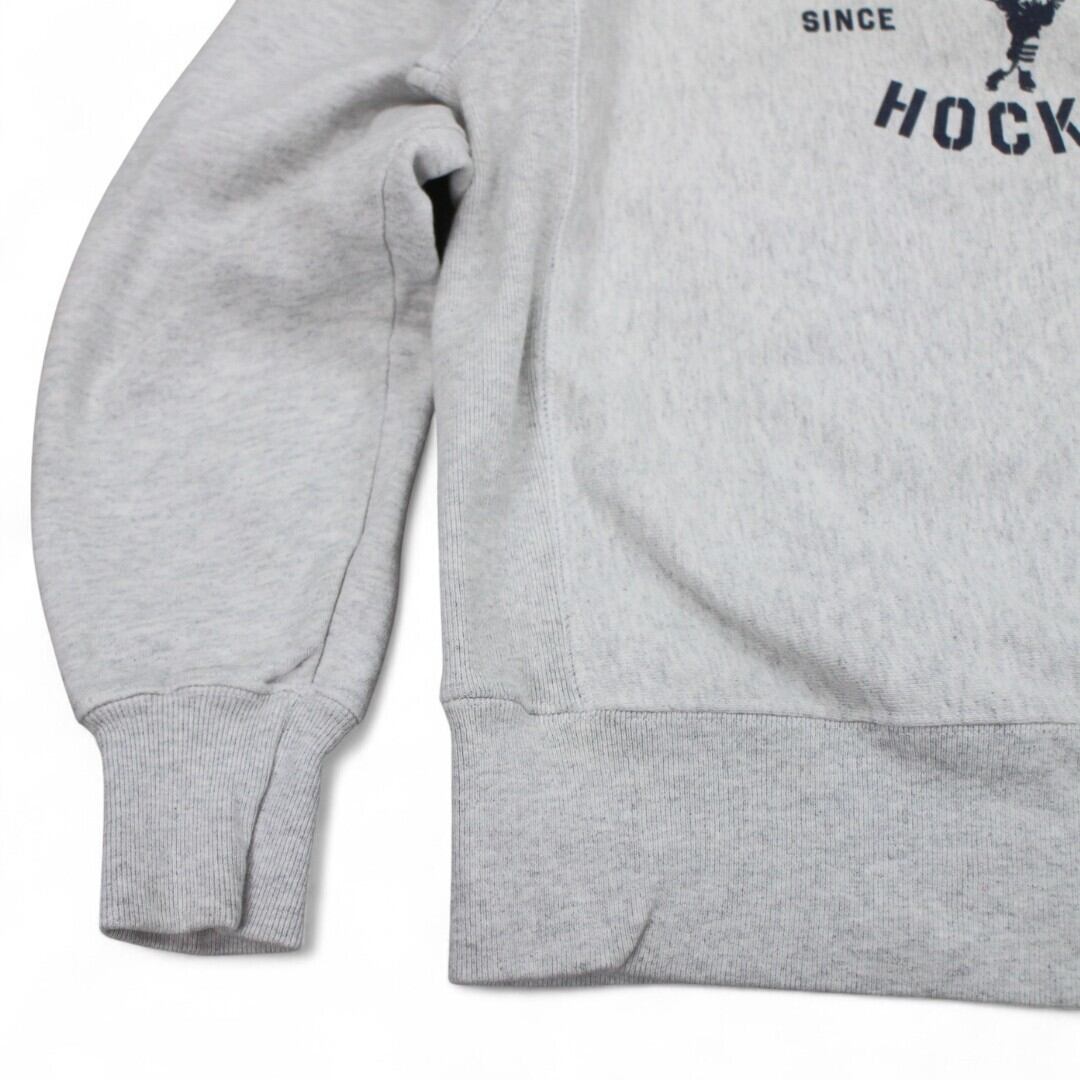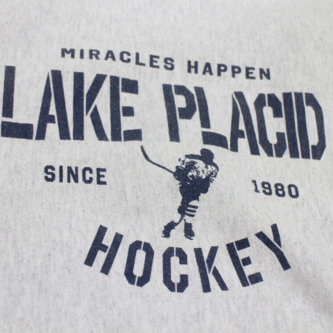 フロントには「LAKE PLACID HOCKEY」ロゴとホッケープレイヤーがプリントされたスポーティーな一枚です。グレーのボディにネイビーのプリントが映えるデザインで、古着らしいフェード感が味のある雰囲気を演出しています。