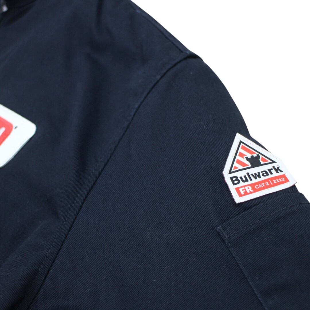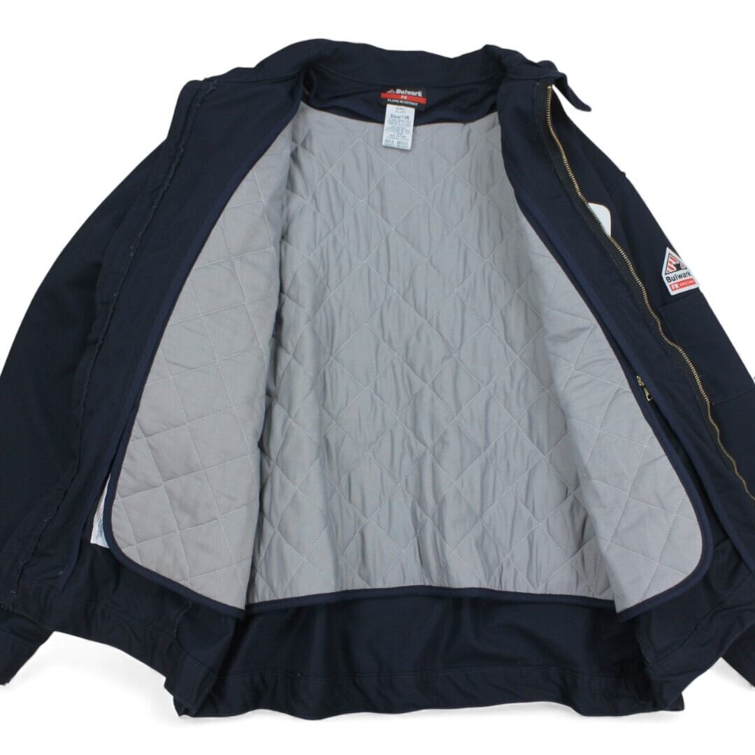 古着 Bulwark のダックワークジャケット。タフな100%コットンダック生地に、着脱可能な裏地キルティングを備えた万能ワークアウターです。ネイビーカラーで合わせやすく、企業ワッペンがアクセントに。軽度のスレはありますが、目立った汚れや破損はなく、しっかり着用いただけます。