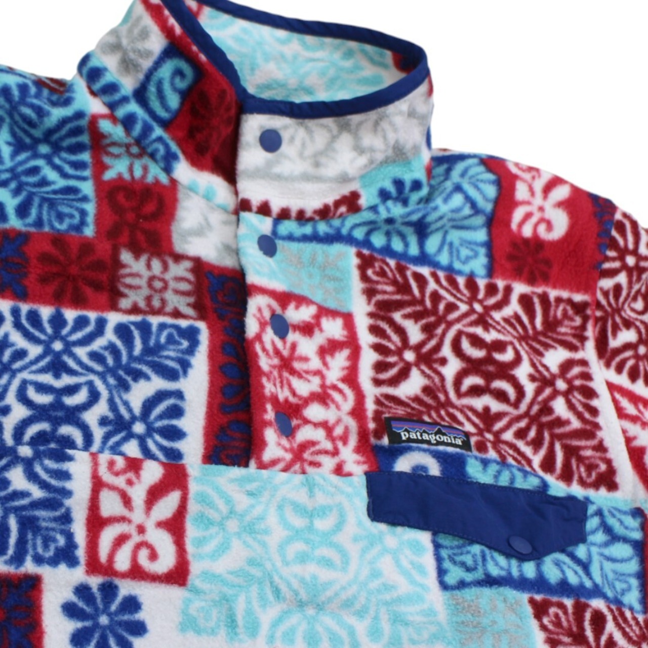 古着 Patagonia のシンチラ スナップT フリースプルオーバー。16年製でマルチカラーが目を引く一着です。柔らかく暖かい100%ポリエステル素材で、デイリーのカジュアルスタイルやアウトドアシーンに活躍します。