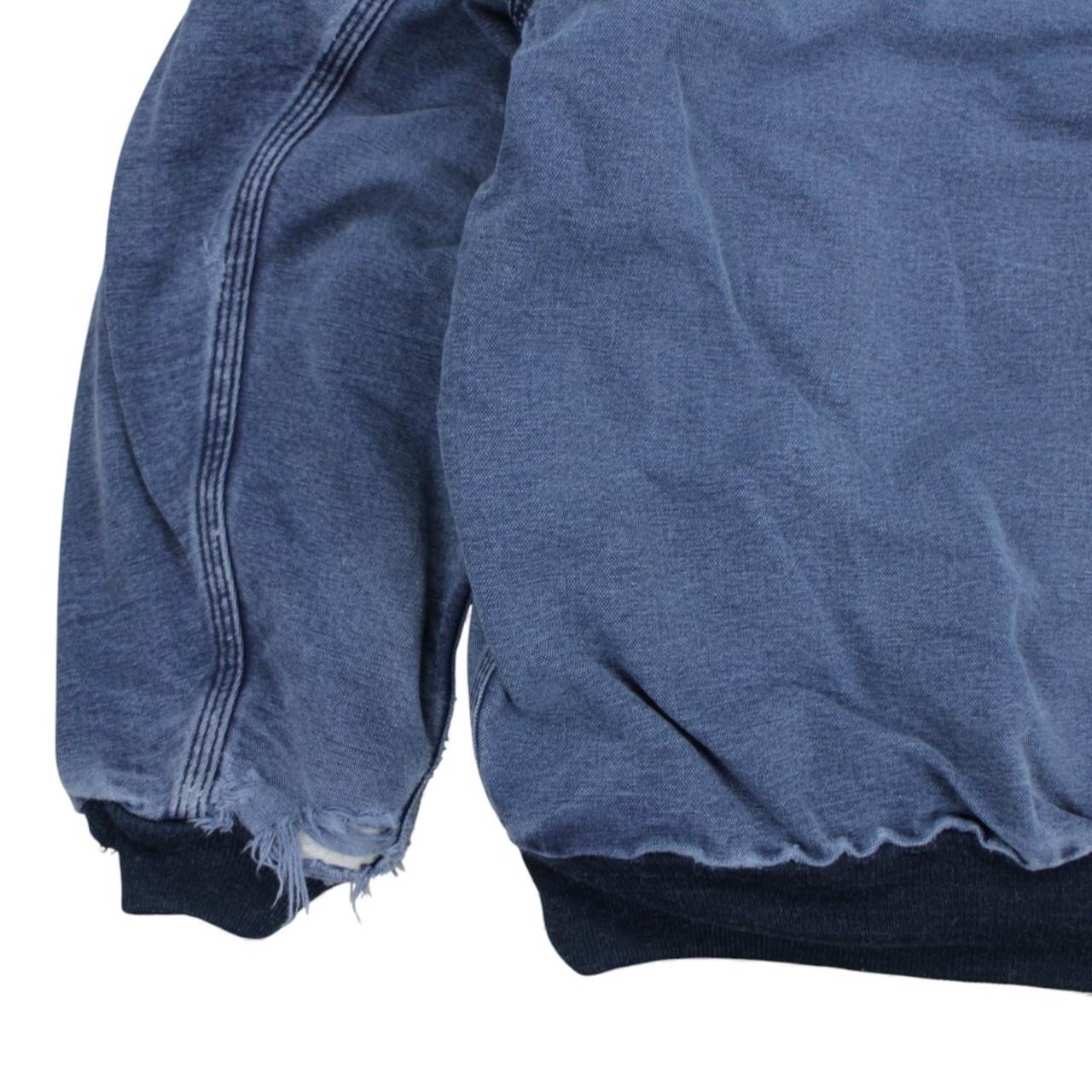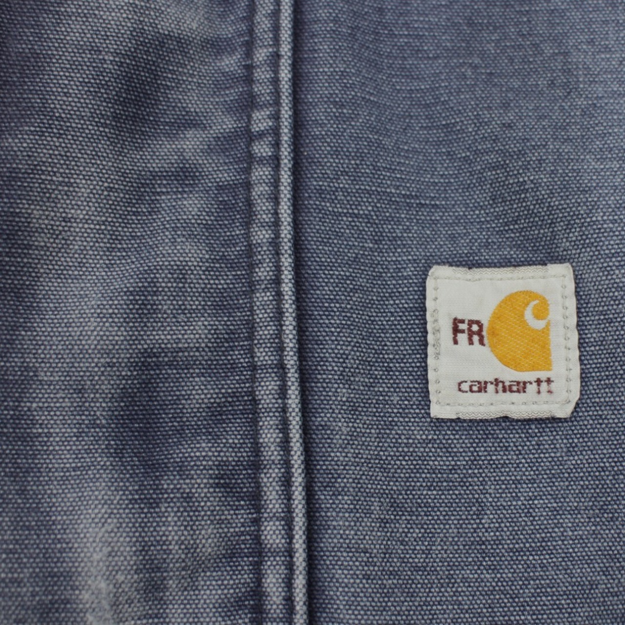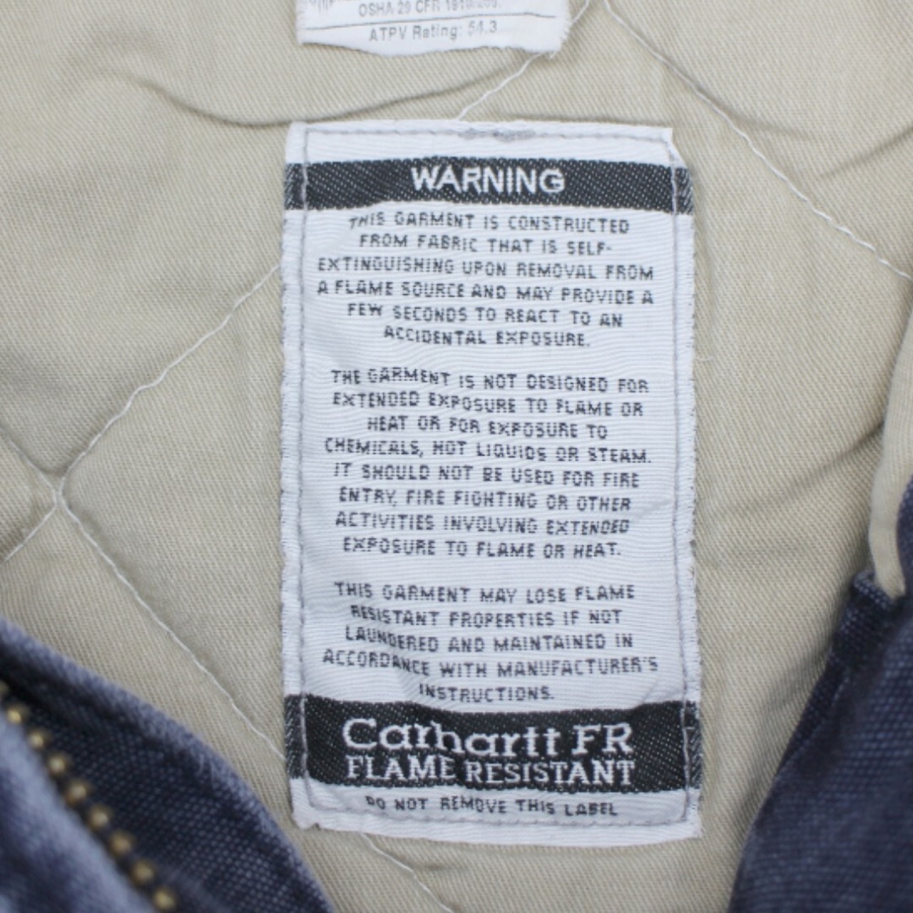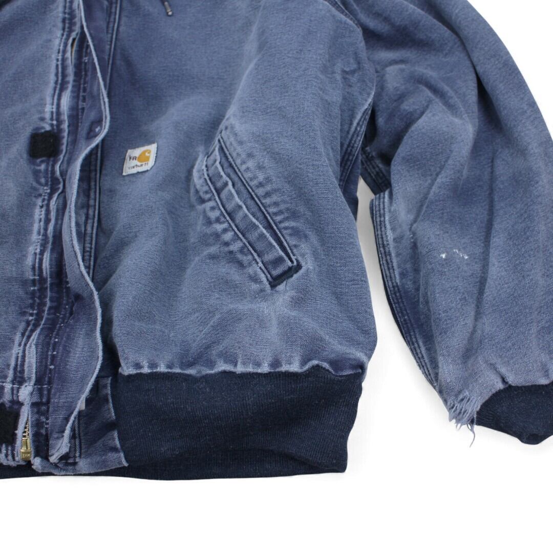古着 USA製 Carhartt(カーハート)のアクティブジャケット FRJ184 DNY。タフな100%コットンダック生地を使用し、裏地はキルティング仕様で防寒性の高いワークアウターです。ネイビー系の落ち着いたカラーで着まわしやすく、フェード感がヴィンテージらしい雰囲気を演出します。ダメージや企業ロゴ刺繍が入り、リアルワークウェアらしい味のある1着です。