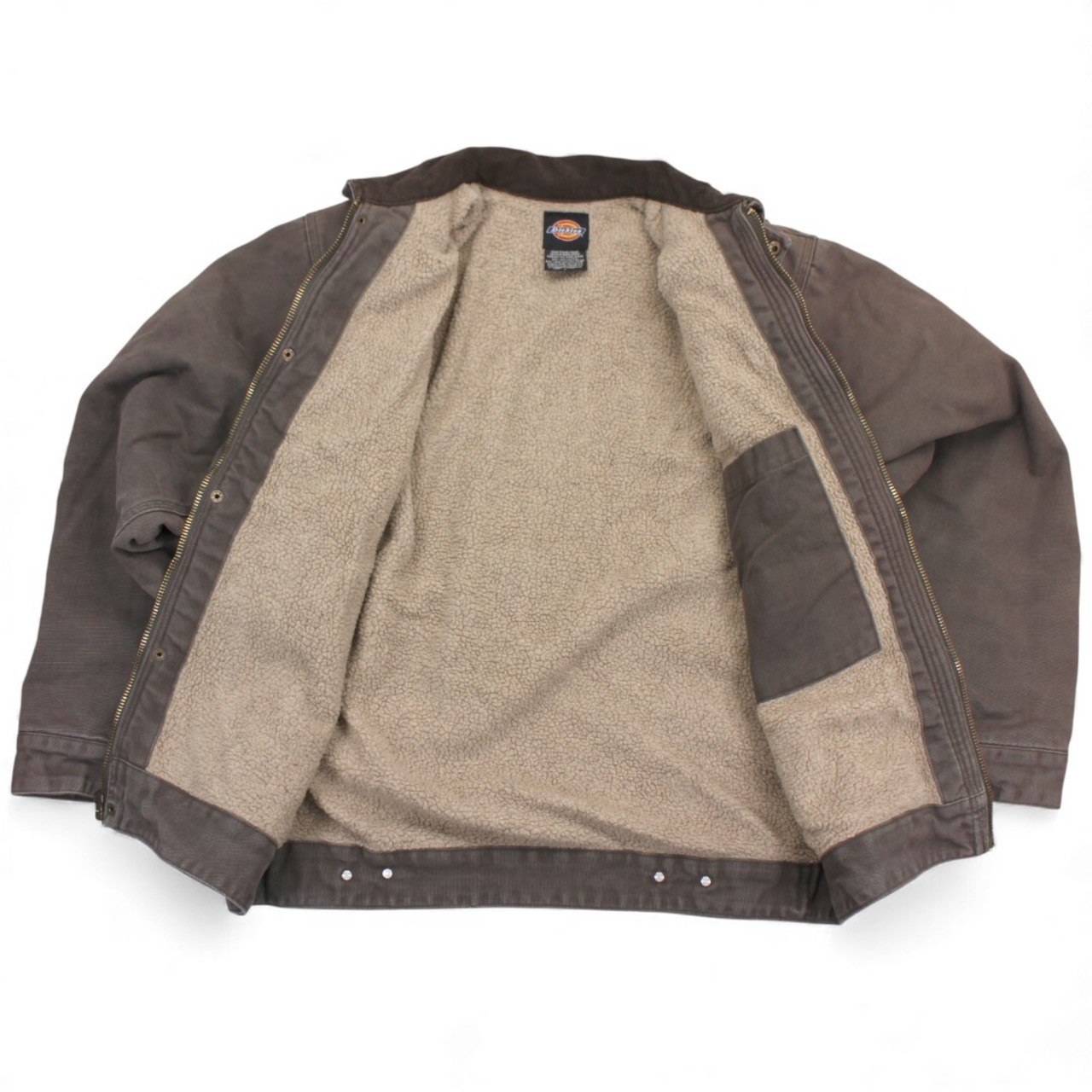 古着 Dickies のダックワークジャケット。タフな100%コットンダック生地を使用し、裏地ボア仕様で保温性に優れたトラディショナルジャケットです。ブラウンカーキの落ち着いたカラーがワークスタイルに馴染みやすく、デイリーにもアウトドアにも活躍する一着です。