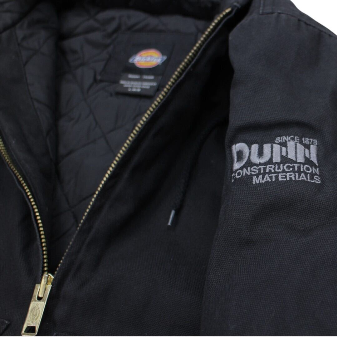 古着 Dickies のダックワークジャケット。タフな100%コットンダック生地に、裏地ナイロンキルティングを採用したアクティブジャケットです。ブラックの無骨なワークテイストに加え、左肩には企業ロゴ刺繍が入りアクセントに。しっかりとした作りでデイリーからワークシーンまで幅広く活躍する一着です。