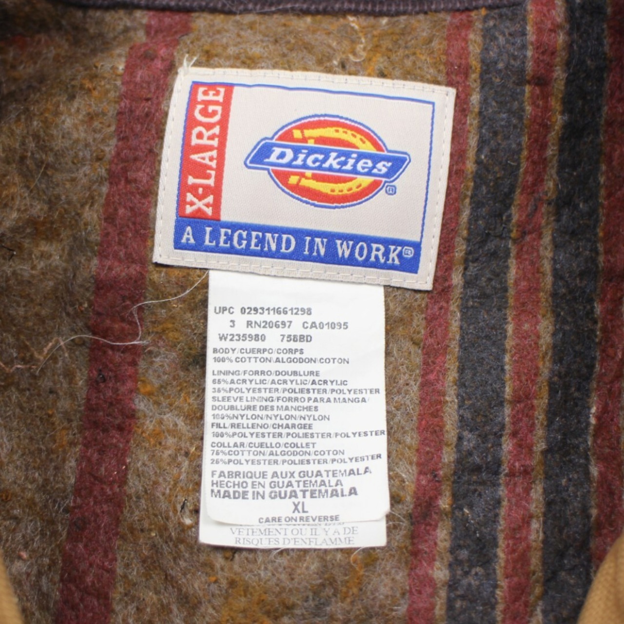 古着 Dickies のデトロイトジャケット。タフな100%コットンダック生地に裏地ブランケットを採用し、保温性と耐久性を兼ね備えた王道ワークアウターです。ブラウンのクラシックなカラーに加え、前右胸には企業ワッペン刺繍が入りワークらしい雰囲気を強調。ゆったり着られるXLサイズで、ストリートからワークスタイルまで幅広く活躍する一着です。