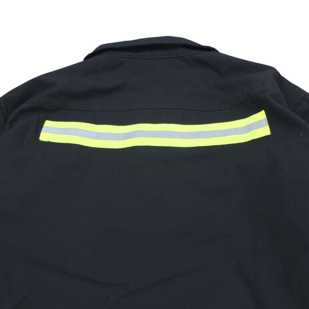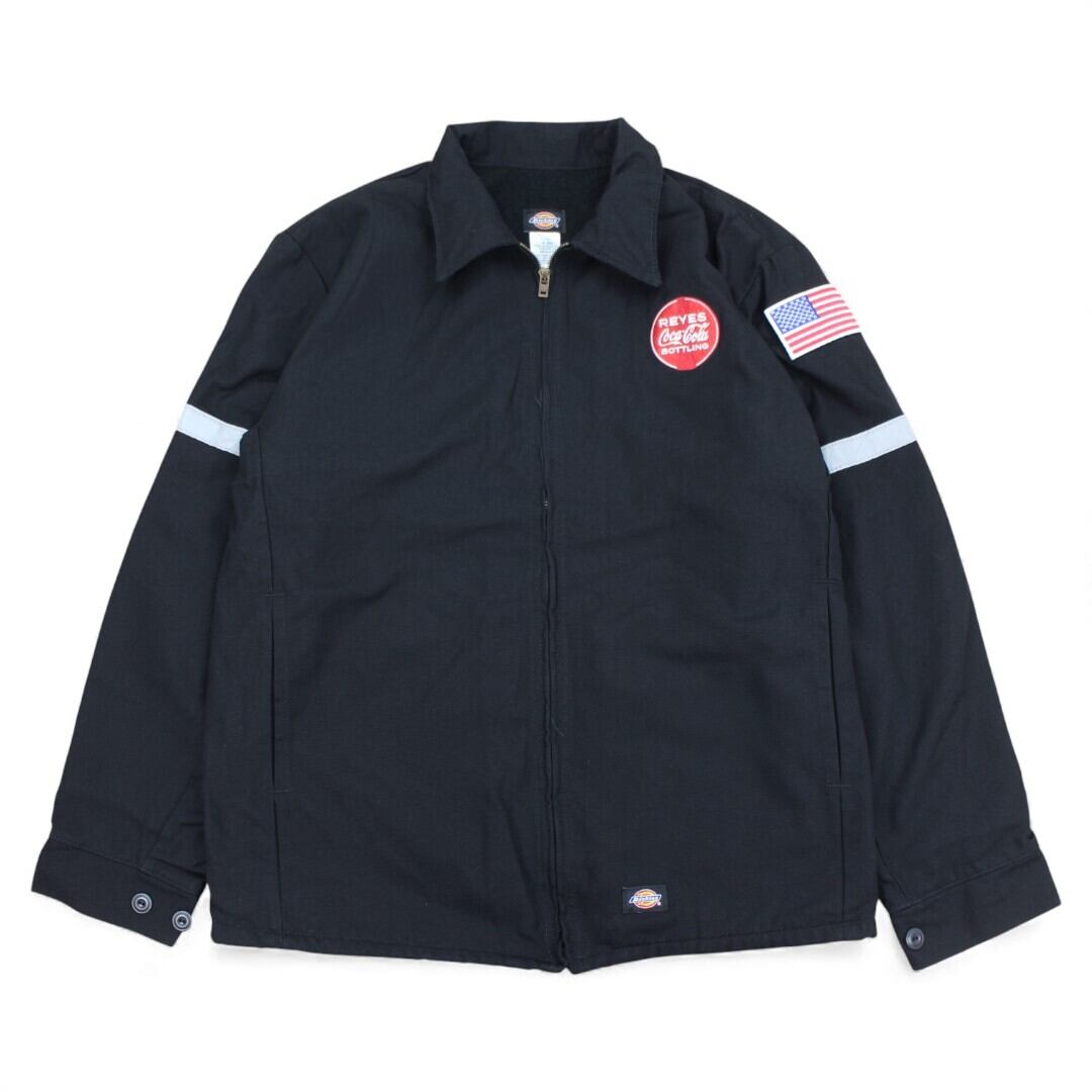 古着 Dickies のダックワークジャケット。耐久性の高いダック生地に、裏地フリース仕様で暖かさも兼ね備えた実用性の高い一着です。ブラックの無骨な雰囲気に加え、前左胸と左肩にはワッペン刺繍、さらに両腕と背中上にはリフレクティブテープが配置された特色あるデザイン。MEXICO製のしっかりとした作りで、タフなワークシーンにも対応します。