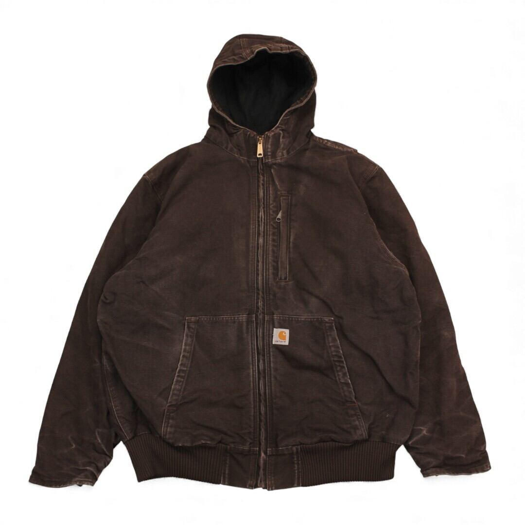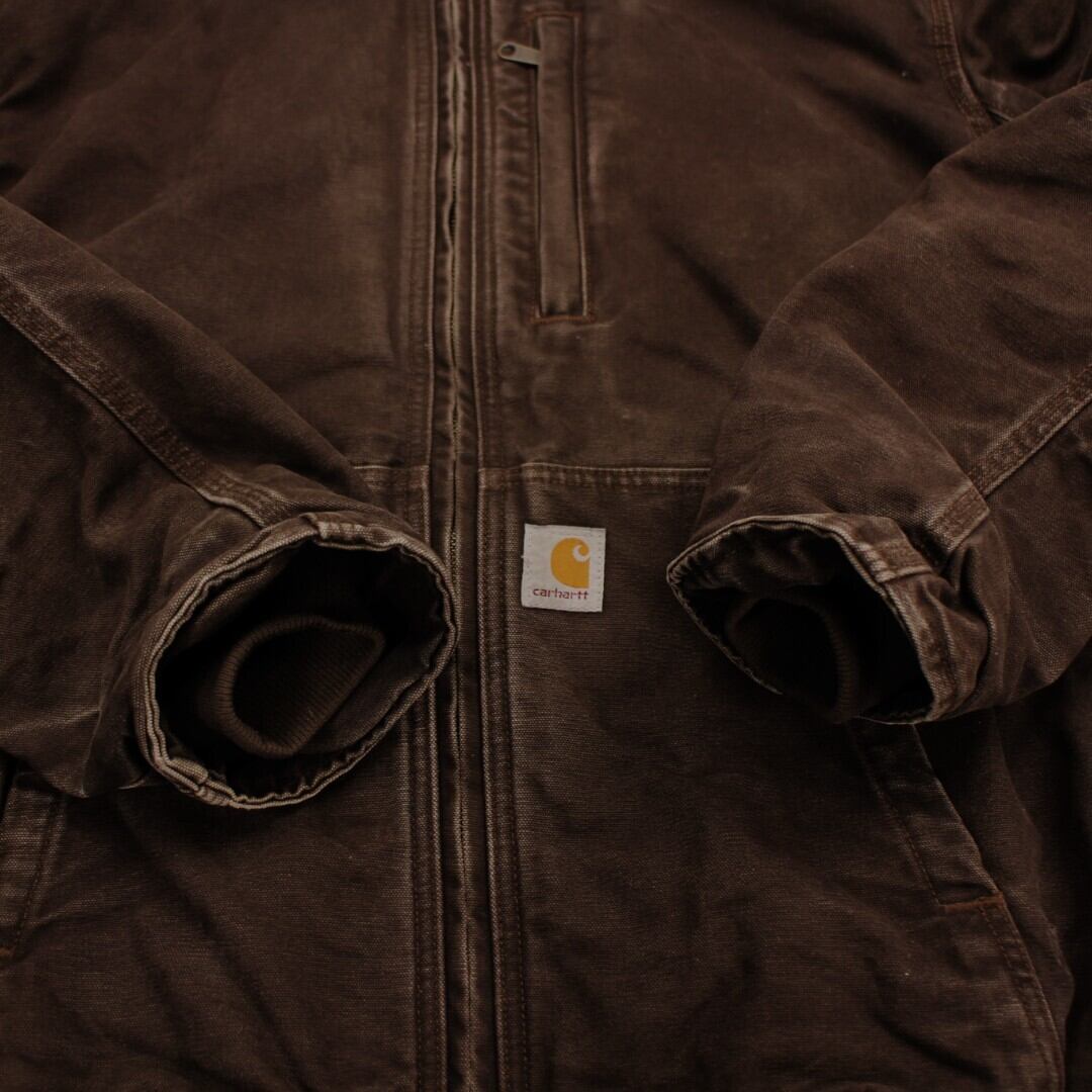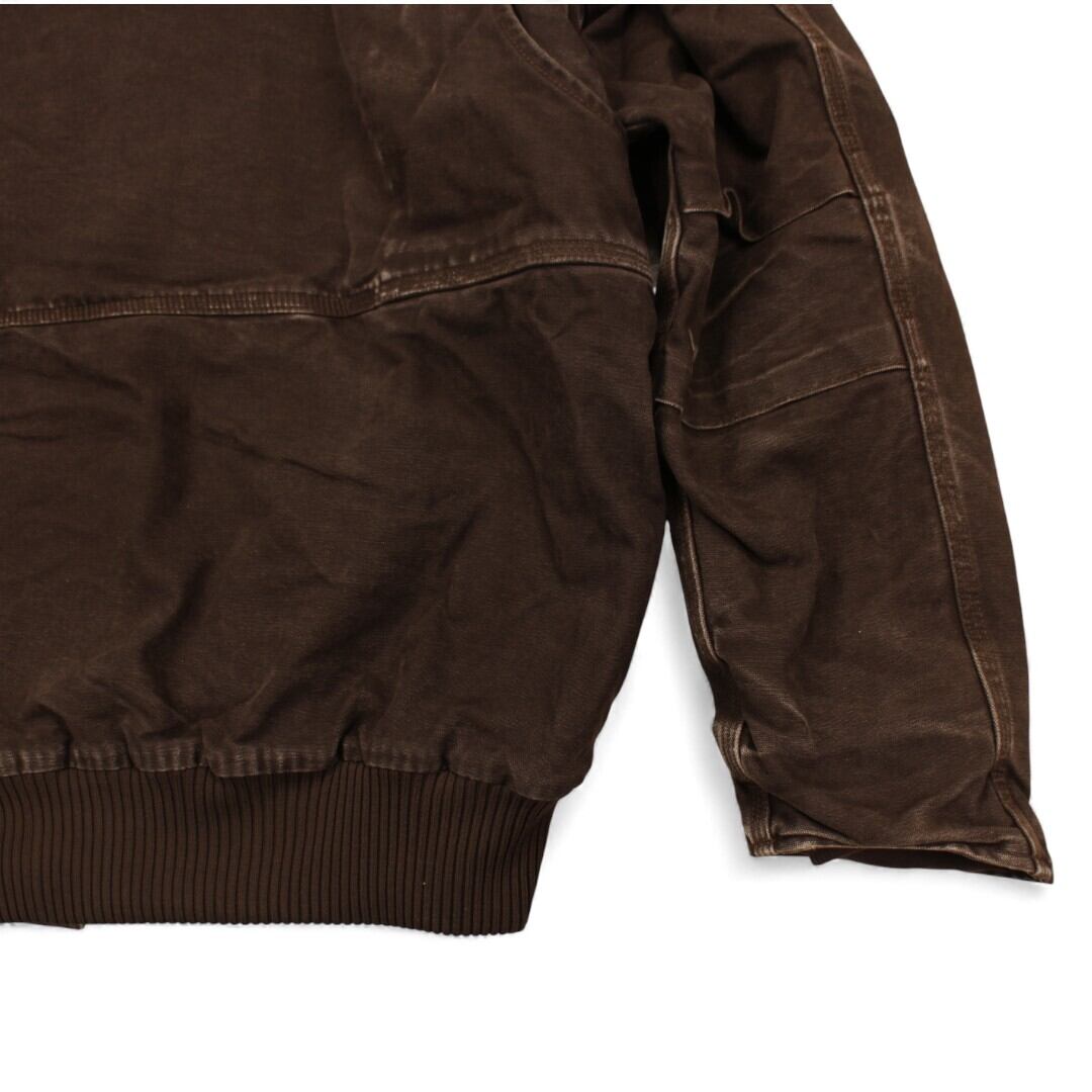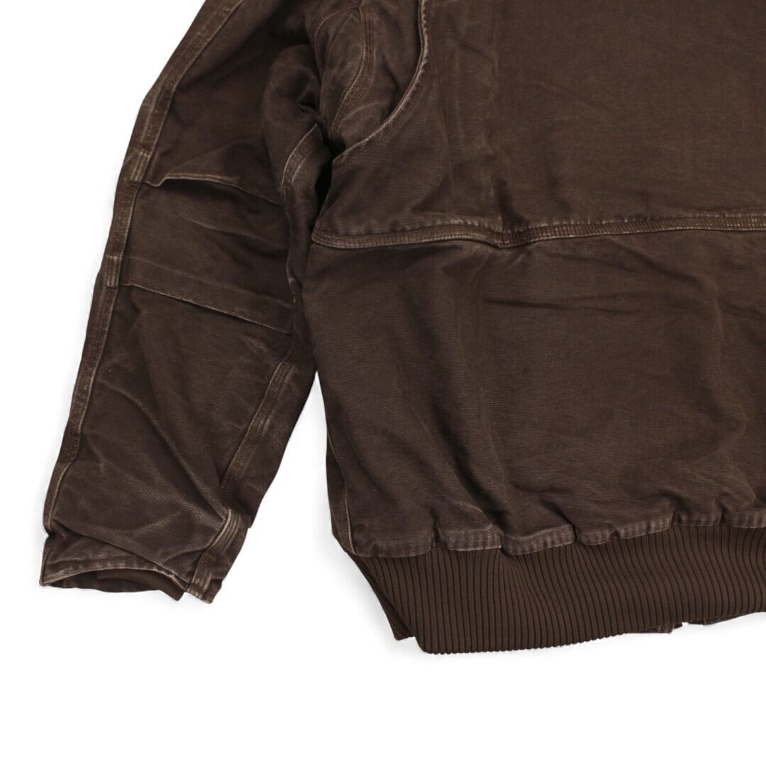 古着 Carhartt のフルスウィングジャケット。動きやすさを追求した Full Swing 仕様で、肩や腕周りの可動域が広く、アクティブシーンでも快適に着用できるモデルです。タフな100%コットンダック生地を採用し、ダークブラウン(DKB)の落ち着いたカラーが雰囲気のある一着。ワークからタウンユースまで幅広く活躍します。