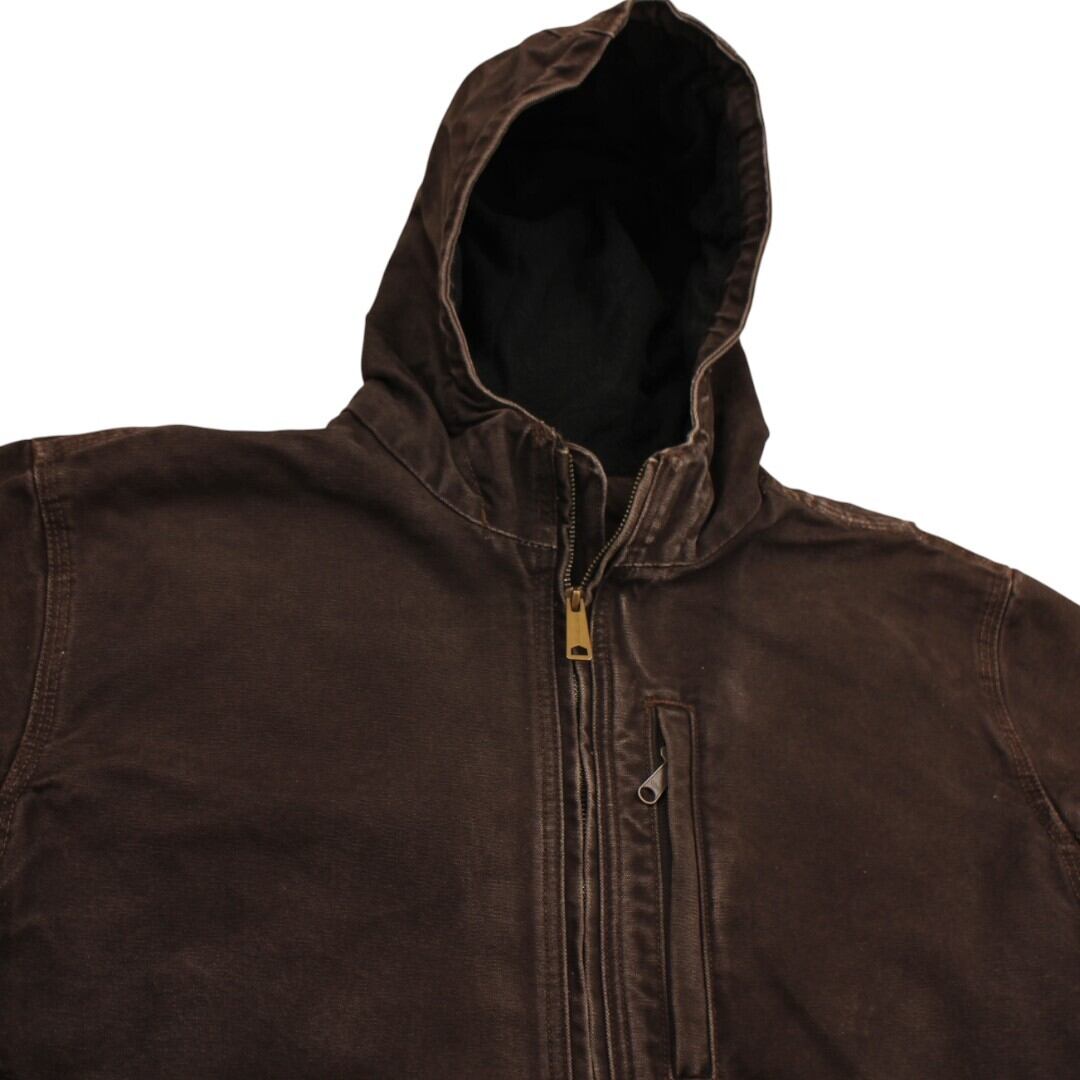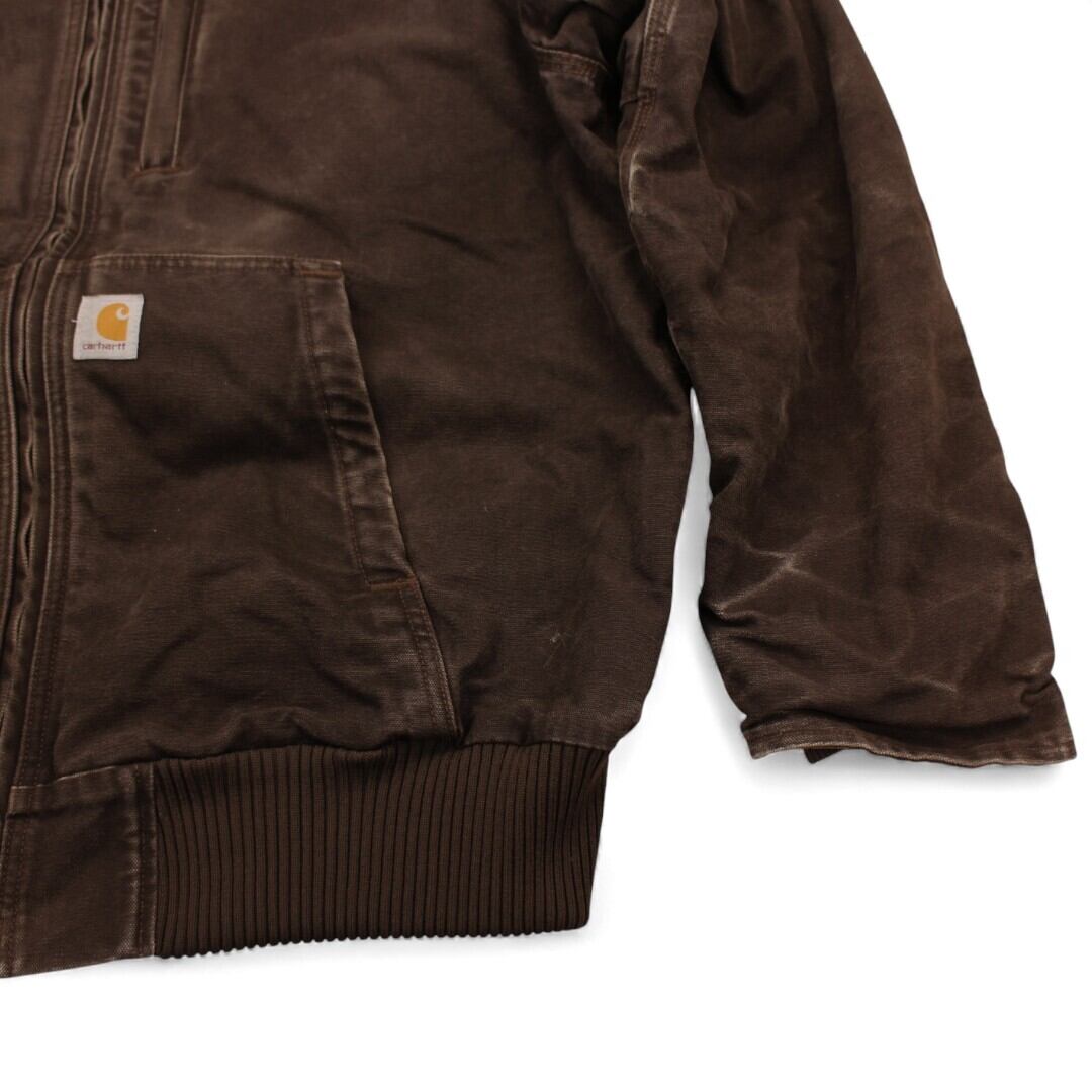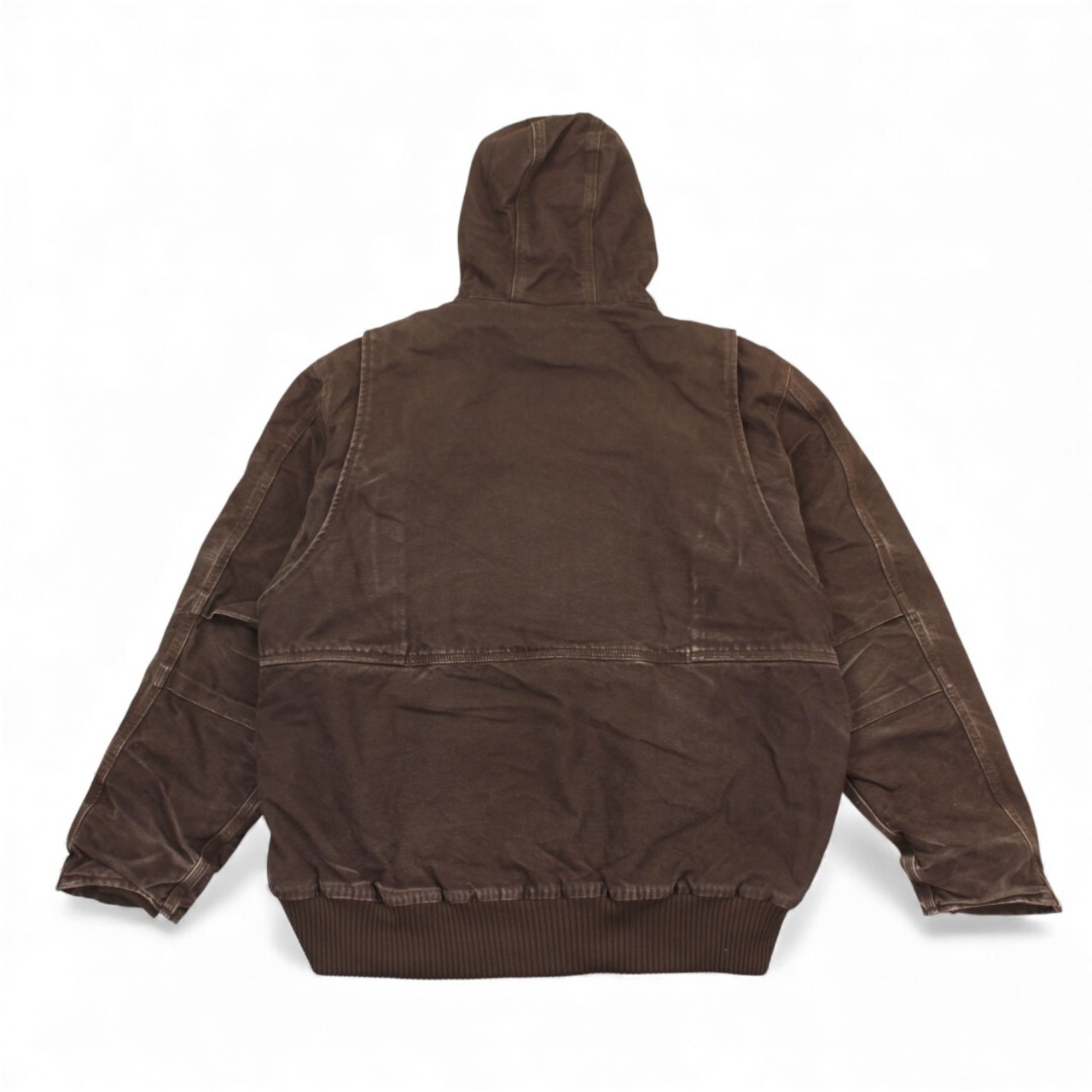 古着 Carhartt のフルスウィングジャケット。動きやすさを追求した Full Swing 仕様で、肩や腕周りの可動域が広く、アクティブシーンでも快適に着用できるモデルです。タフな100%コットンダック生地を採用し、ダークブラウン(DKB)の落ち着いたカラーが雰囲気のある一着。ワークからタウンユースまで幅広く活躍します。