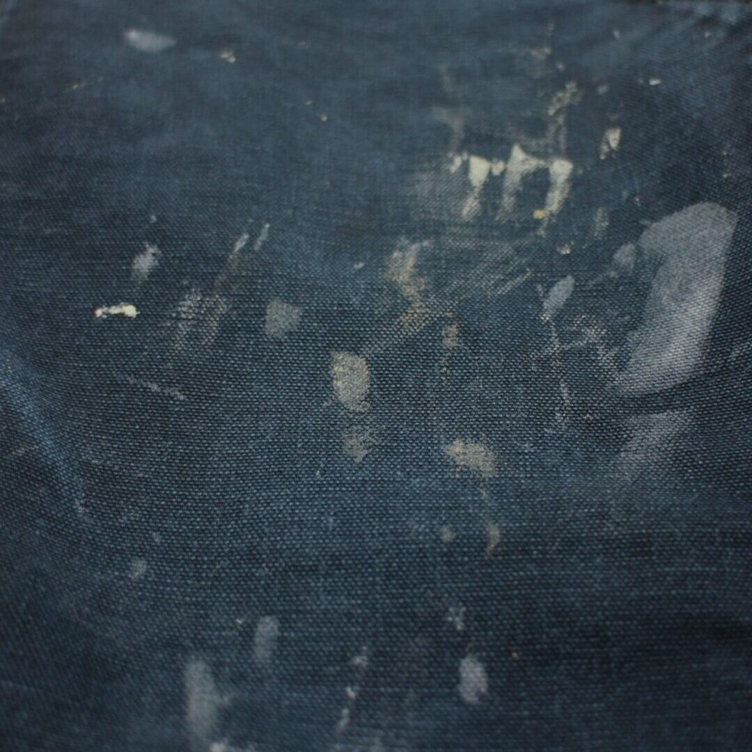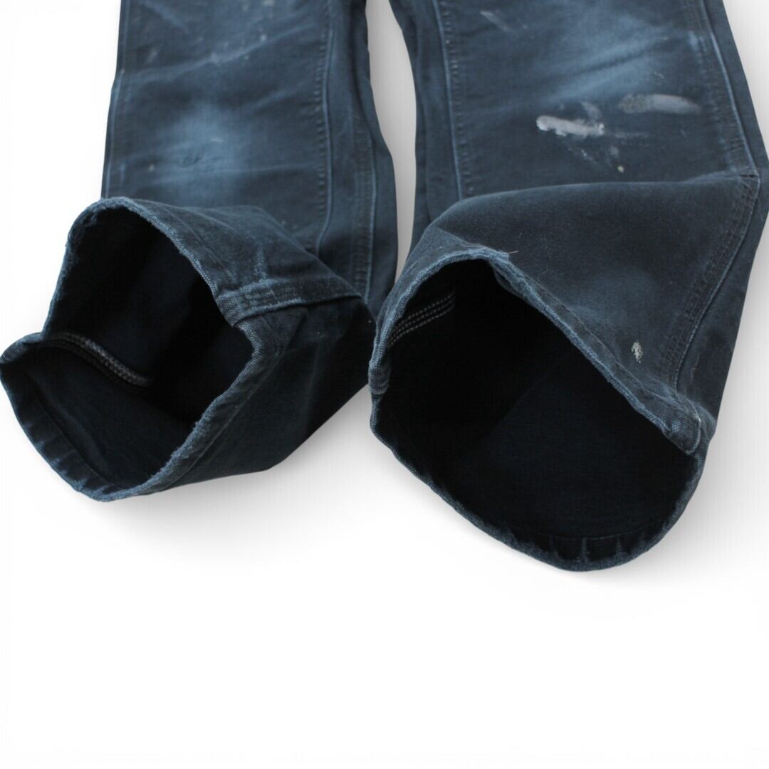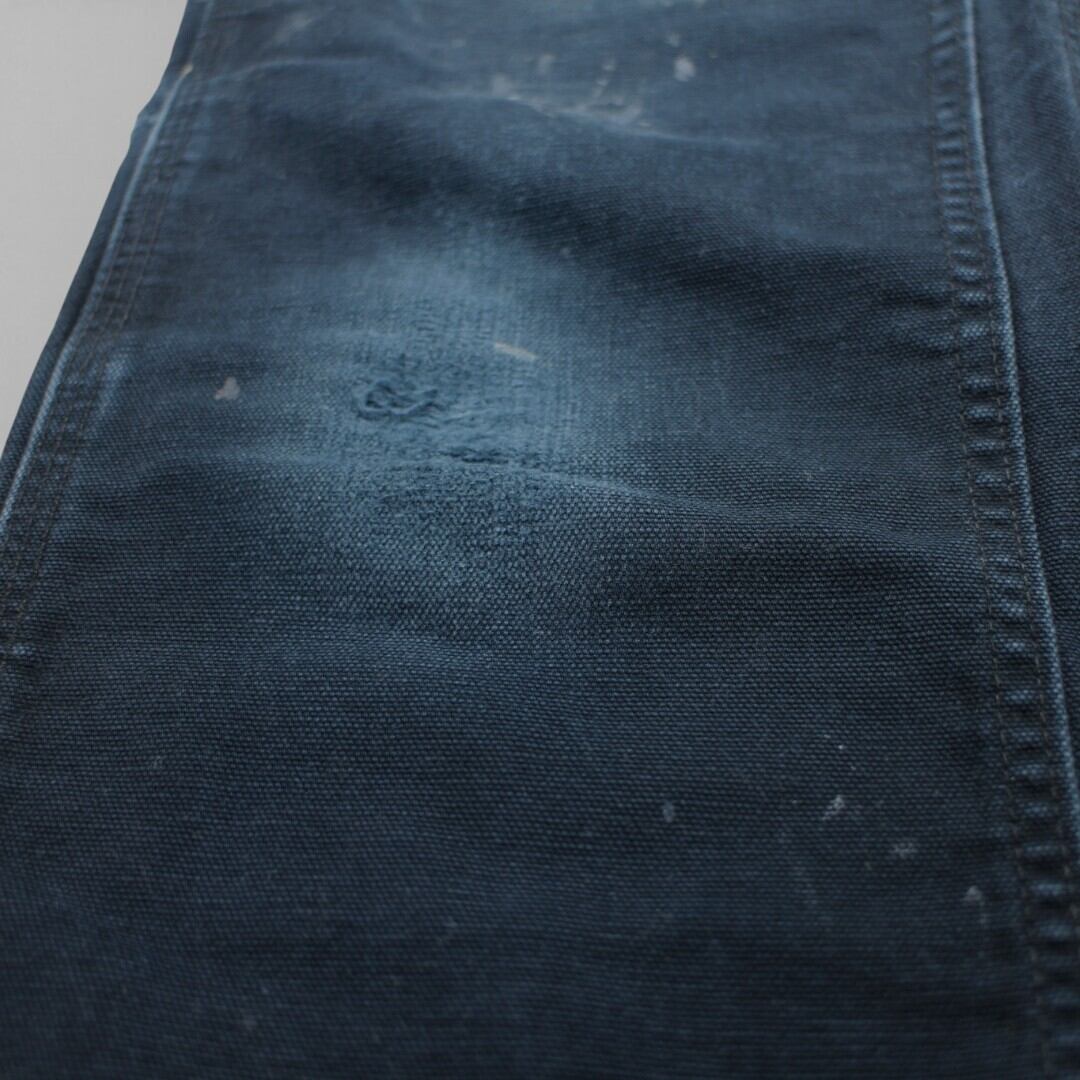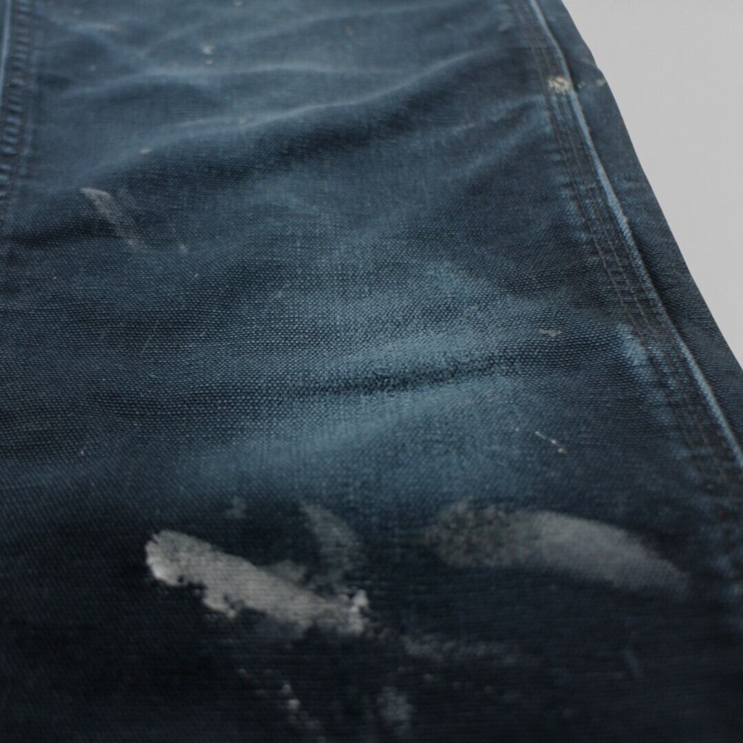 全体にフェード感があり、前ポケット下や膝周辺のペンキ汚れ、各所のダメージがリアルなワークユーズド感を演出しています。