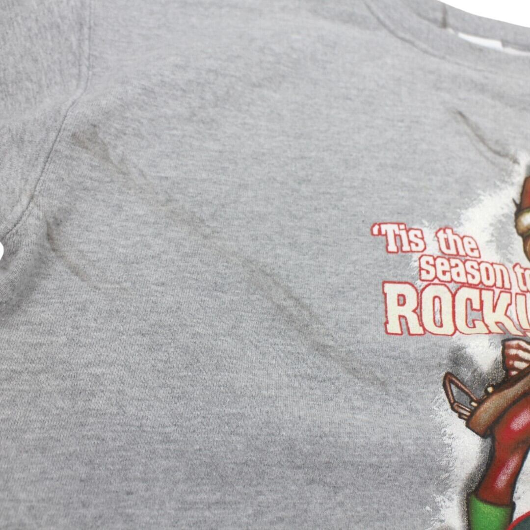 フロントにはクリスマスモチーフのギタープレイヤーとロゴを配した、遊び心のあるグラフィックが特徴の一着です。