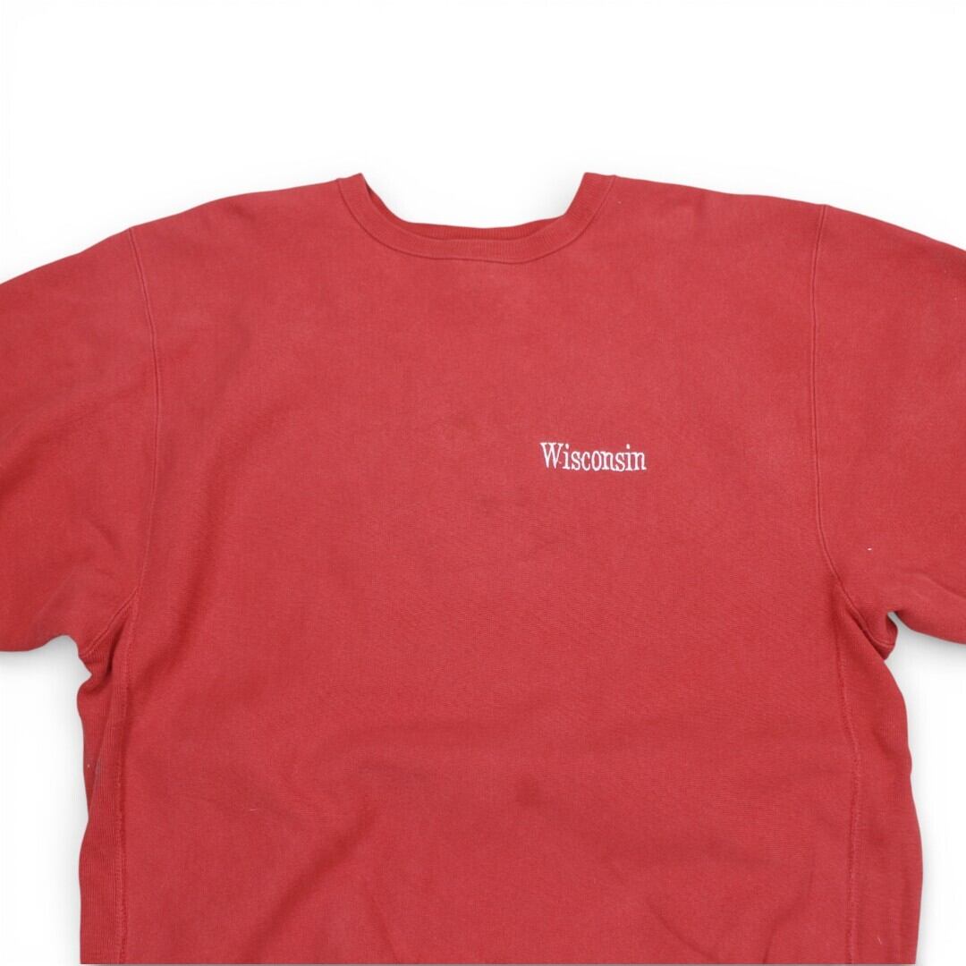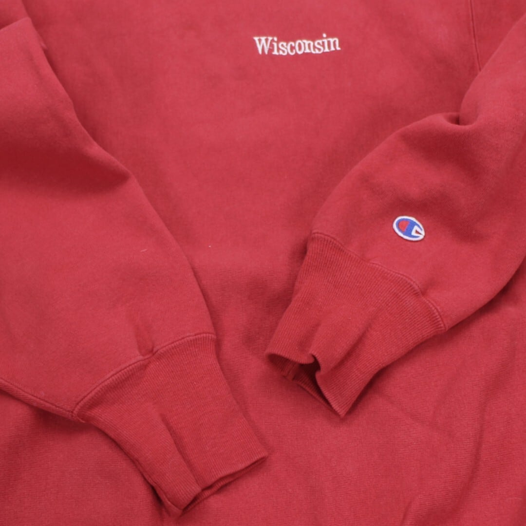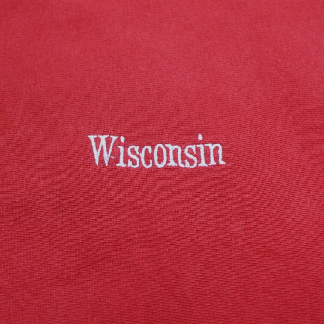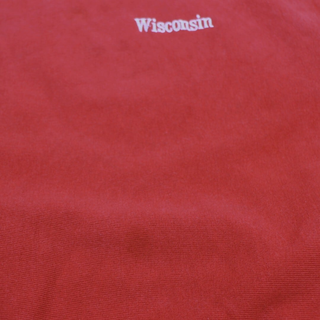 落ち着いたレッドカラーに、胸元の「Wisconsin」ワンポイント刺繍が映えるシンプルなデザイン。