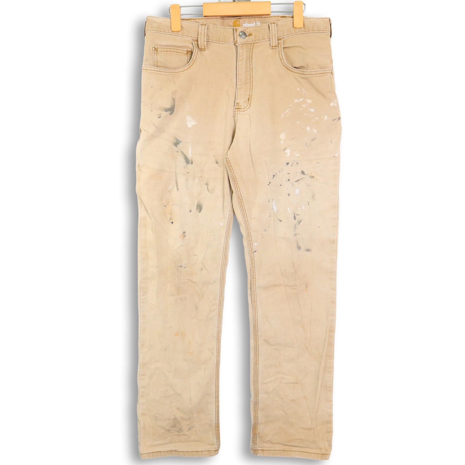 耐久性の高いコットンダック生地を使用したワークパンツで、リアルなフェード感やペンキ汚れがヴィンテージらしい雰囲気を演出しています。