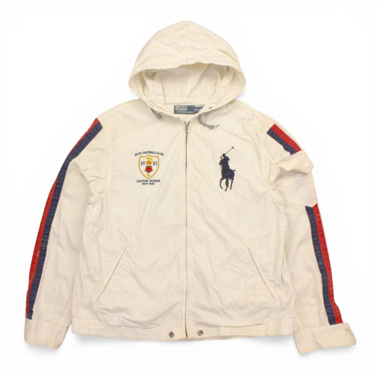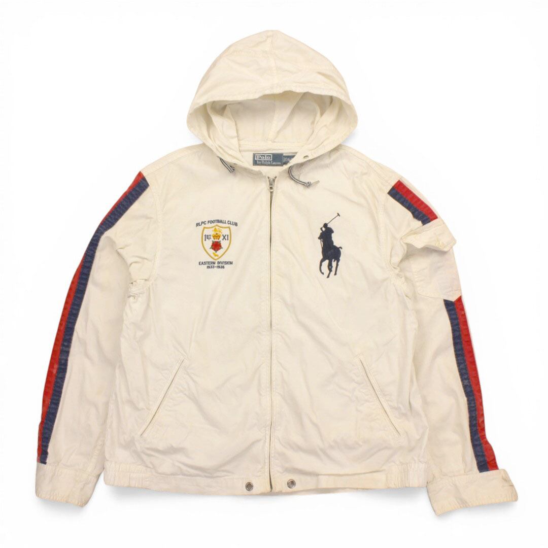 袖のラインデザインやフード付きのディテールがアクセントとなり、ラルフローレンらしいクラシックなスポーツスタイルを演出。