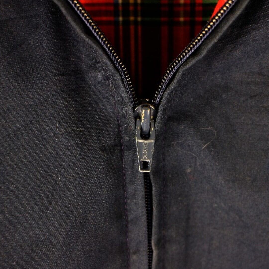 USA製のヴィンテージアイテムで、シンプルなネイビーカラーに裏地のタータンチェックが映えるクラシックな一着です。